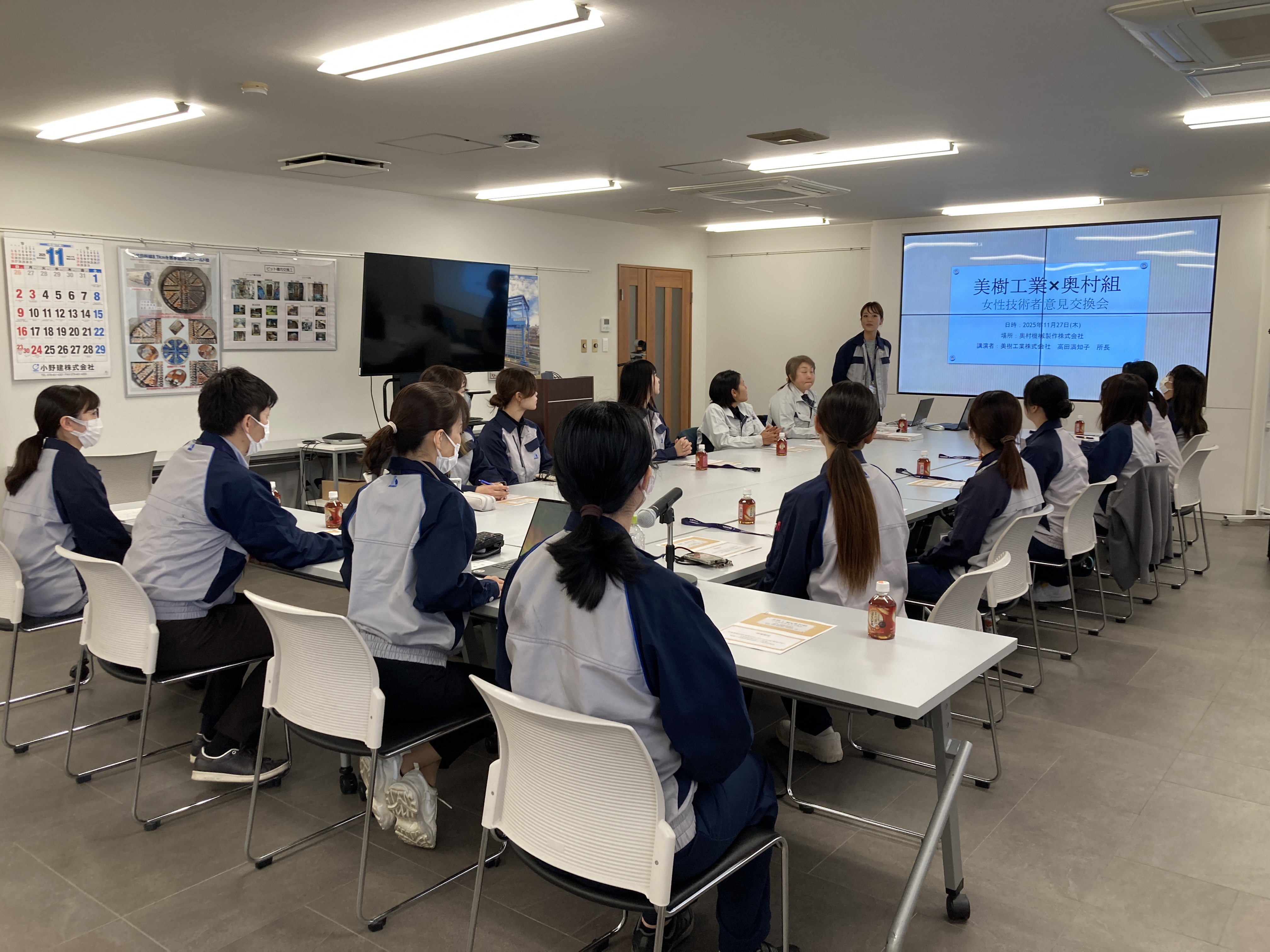 2025年11月27日、美樹工業株式会社の高田所長をお招きし、女性技術者の活躍をテーマとした意見交換会を開催しました。当社からは土木・建築部門に所属する9名の女性技術者が参加し、高田所長からは豊富な現場経験に基づく実践的なアドバイスや、“現場で力を発揮するために必要な考え方”について大変分かりやすくご講話いただきました。参加者からは多くの質問が寄せられ、キャリア形成や働き方など、多岐にわたるテーマで活発な交流が行われました。