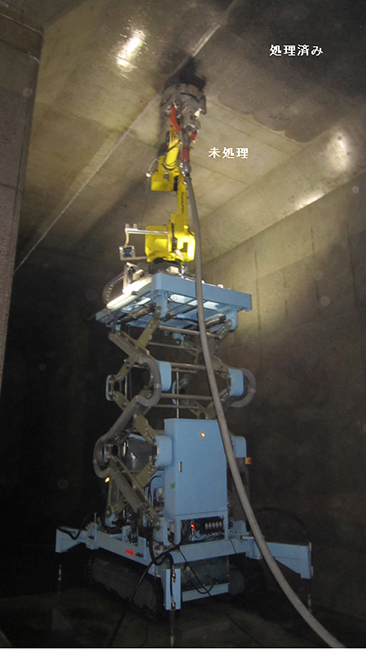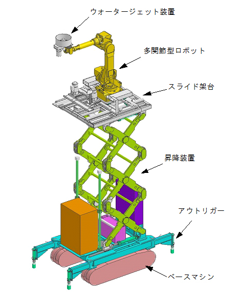 本機は、表面処理を行うウォータージェット装置、それを天井面に押し当てながら前後左右にスライドさせるアーム(多関節型ロボット)、アームの稼動域を広げるスライド架台、高さを調節する昇降装置、自走可能な電動式のクローラ型ベースマシンから構成されています(図1)。