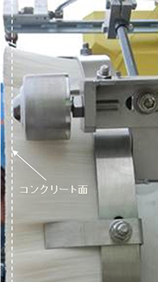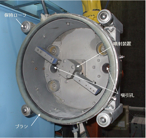ウォータージェット装置は、ノズルを高速回転させながら超高圧水を噴射する構造になっており、四隅にノズルと天井面との距離を一定にする保持ローラを取り付けたことで、コンクリート表面を均一に仕上げることができます。また、ノズル噴射部をブラシが付いた鋼製カバーで覆い、内側に2ヵ所の吸引孔を設けたことで、ミストや粉塵などの飛散を抑止します(写真1,2)。