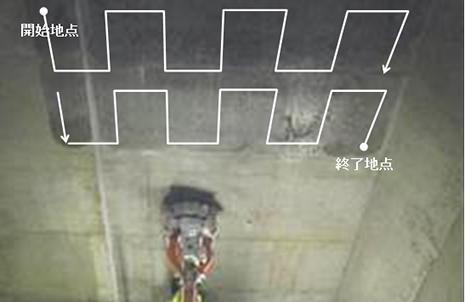 本機は、1サイクルで最大6.6m2(2.0m×3.3m)の天井面を自動で表面処理することができます。ウォータージェット装置を所定の高さに合わせた後、表面処理する開始地点と終了地点(処理範囲における対角2点)を遠隔操作で指示すると、ウォータージェット装置は超高圧水を噴射しながら、定速で規則的にスライドして処理を行います(写真3)。